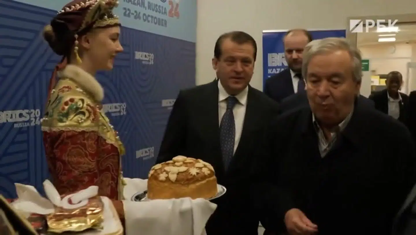 Hans besøg er blevet kaldt en »diplomatisk sejr« for Putin. Nu bliver FN-chef António Guterres' entré på topmødet bemærket på sociale medier.